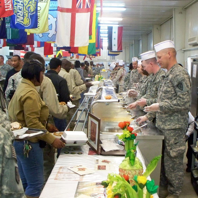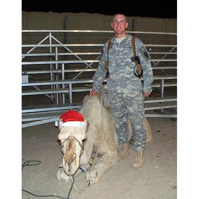 In Afghanistan in 2010, Jay remembers joining other supervisors in the dining facility to serve the junior soldiers on base, a tradition in the armed forces on Thanksgiving and Christmas. "We were inside the Green Zone, which isn't totally safe," he remembers. "Everyone was told to write home and have some sort of festive, Christmassy clothes sent over. The girls got their finest and the guys got sweaters and we had an evening dinner and it was all lit by candles."