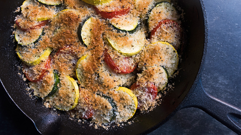 After 20 minutes, remove the tian from the oven and sprinkle the breadcrumb mixture on top of the vegetables. Return the pan to the oven for another 10 minutes or until the top is golden brown and crispy.