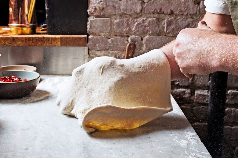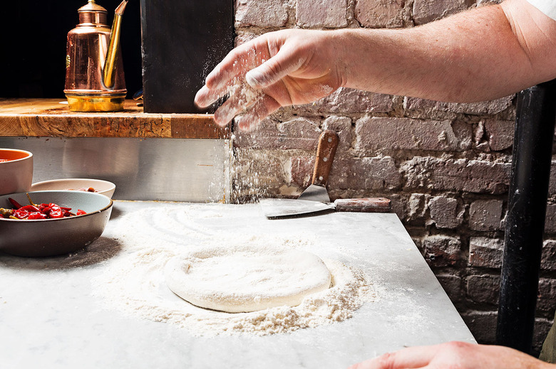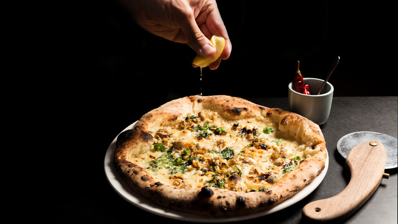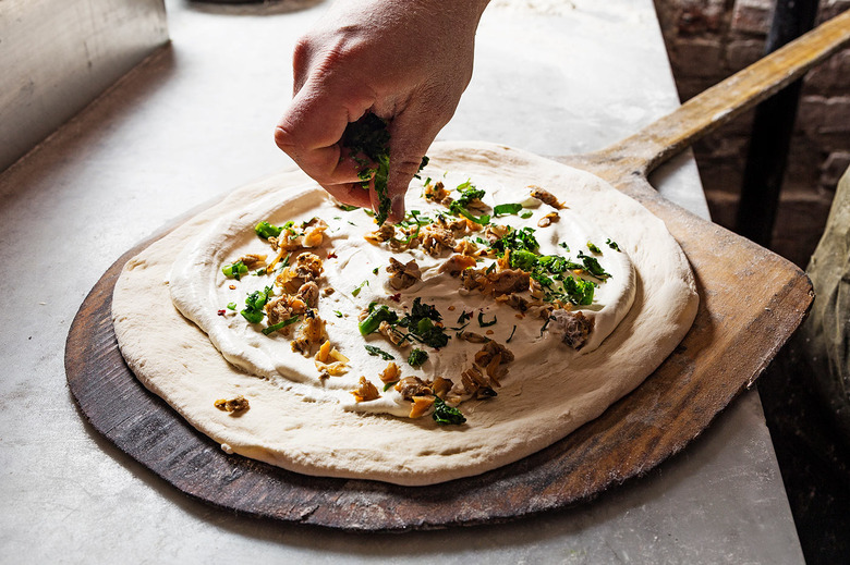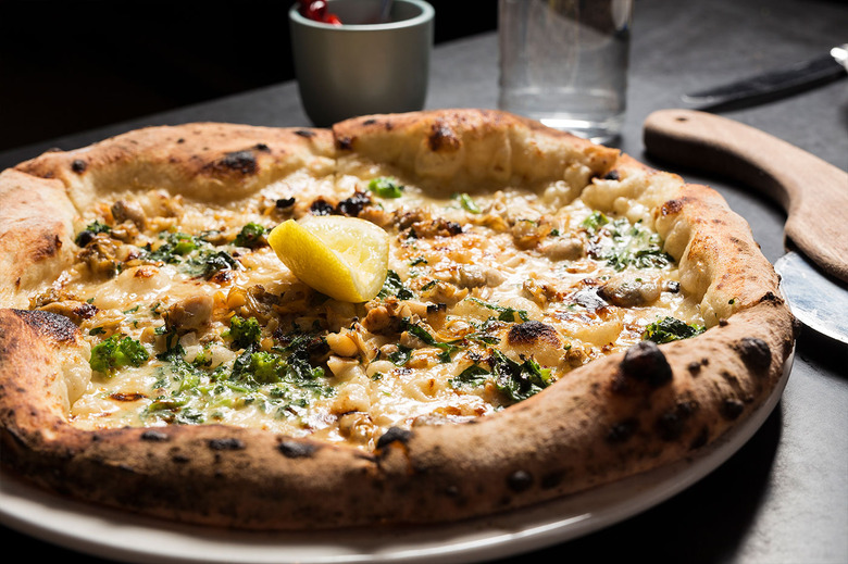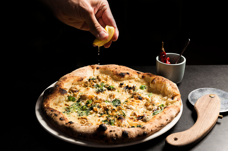 At Pasquale Jones, Caspare whips the cream-based, clam liqueur-spiked sauce, because it's easy to spread and slows the caramelization, preventing ingredients from over-charring in the hot oven. A squeeze from the lemon served on top of the pie or a few drops of fermented Calabrian chile oil from a jar on the table pierces through the sauce's "umami vibe," as Caspare calls it, brightening the whole dish.