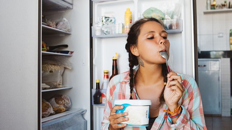 Although it's practically impossible to forget about a tub of ice cream in the freezer, it does happen. And while that pint that got hidden behind bags of frozen veg for months is a welcome surprise when you spot it, that excitement quickly fades when you open it and see a thick layer of freezer burn on top. While still safe to eat, the texture won't be creamy like fresh ice cream, as the formation of ice crystals dries out the dairy treat.