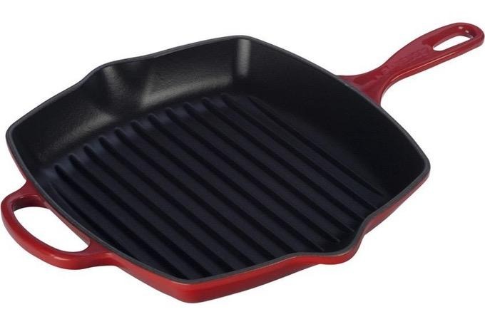 Why We Like It: This little cast-iron number gets our vote for the cutest grill pan; the enamel exterior comes in a dozen of Le Creuset's signature bright colors, and the pour spouts are handy for draining grease. The ridges, nearly as deep as Staub's, give distinct grill marks, while the black enameled interior offers excellent release of even delicate fish, so long as you brush the pan with enough oil first. The Le Creuset is also easier to clean than some of the other cast-iron pans we tested.