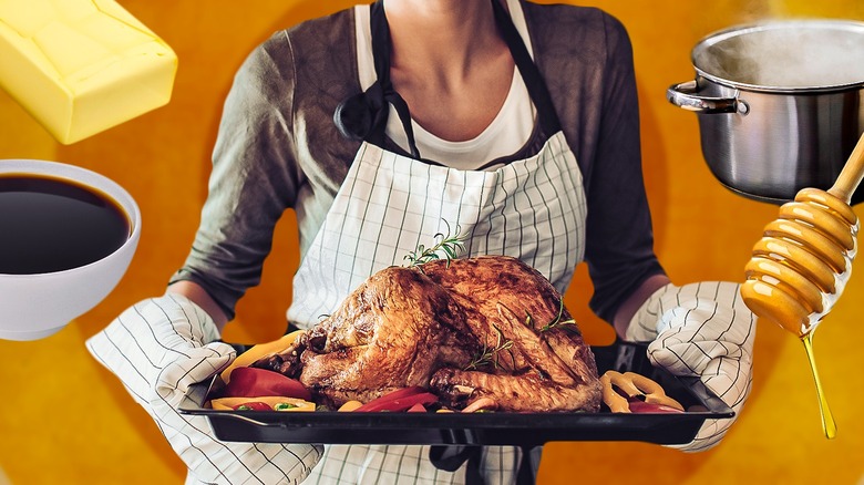 It's a sad misconception that flavoring your turkey is mostly finished once it enters the oven. There's still more you can do. In reality, adding a glaze partway through the roasting process can significantly enhance the flavor by adding a subtle sweetness to the finished roast turkey. After your turkey has been roasting for about two hours, consider applying a glaze made from a blend of honey, corn syrup, seasonings, and melted butter.