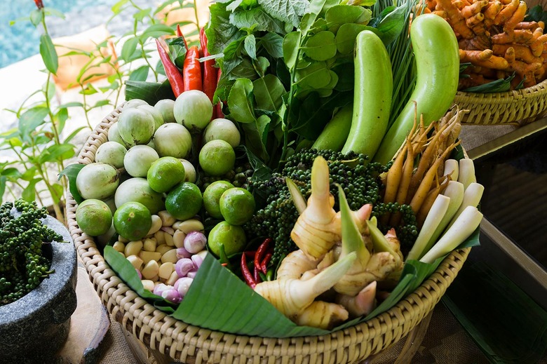 When eating dishes such as laab or nam prik you'll also be served a plate of vegetables and herbs on the side. These are an integral part of the meal, adding bitterness and brightness to the dish. And many of these herbs also help aid digestion.