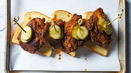 It comes in heat levels that range from the tame Cali Mild to Music City Medium and up to the maximum Nashville Hot. There are also sides like baked beans and potato salad, and, as is tradition, the chicken comes with white bread and pickles.