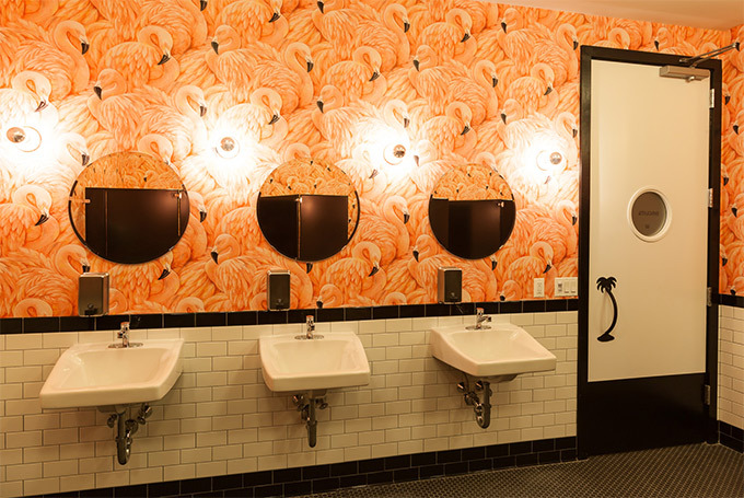 Upon first glance, Brooklyn's Royal Palms seems relatively minimal—the breezy industrial space is filled with casual bars, food trucks and shuffleboard courts. The bathrooms, however, are a delightful surprise: Walls are covered in textured paper depicting flocks of life-size pink flamingos. The birds' feathers are slightly in relief, adding to the drama. Try not to take a selfie in this bathroom, we dare you.