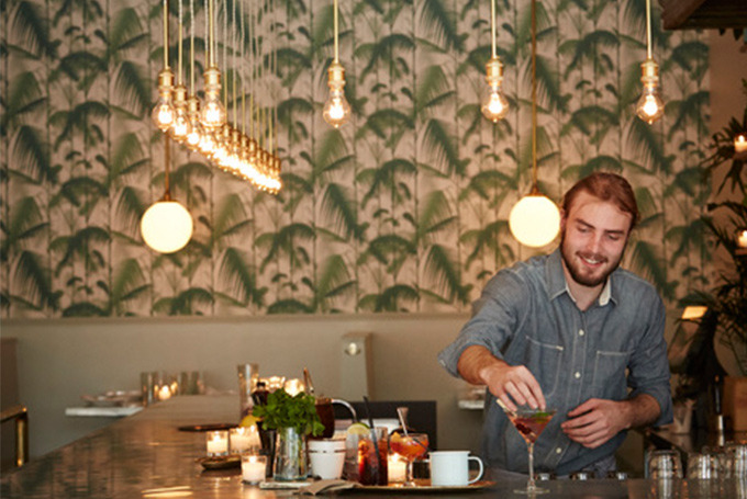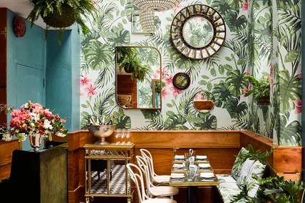 San Francisco's latest hot spot is a tropical oasis where patrons can slurp oysters, crack open lobster claws and enjoy cocktails while surrounded by palm fronds, wicker furniture and shimmering mirrors. The pink-and-green botanical wallpaper soars up the double-height space, creating the illusion of a secret urban jungle. Mismatched floral furnishings give the restaurant a cozy, homey vibe.