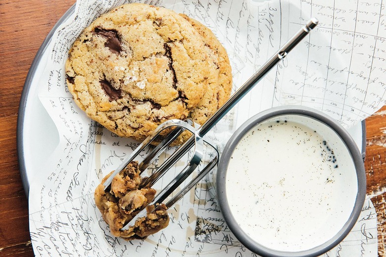 Chef Kelly Fields uses high-quality Valrhona chocolate and serves these chewy, soft and crunchy cookies with Tahitian vanilla-infused milk for dunking—and an egg beater adorned with some unbaked cookie dough.