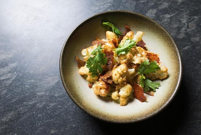 The cauliflower with tandoori chicken skin at Chicago's Parachute dolls up chicken skins and cauliflower—the vegetable world's version of a sponge—with tandoori masala spices, including coriander, fenugreek, chile, cassia, cumin and ginger. Although chicken meat is typically used in classic tandooris, Parachute's version proves that the skins' crunchy texture can support the sizzle, particularly when served with raita, a cooling, yogurt-based Indian condiment, to temper the heat.