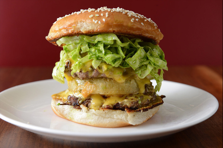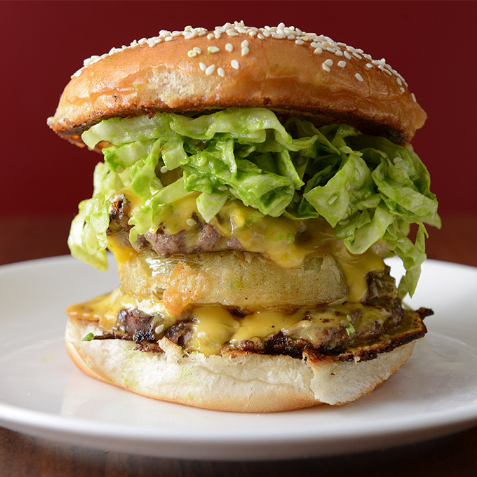 Ed Lee's stacking beef patties and fried green tomatoes at his upcoming spot, Whiskey Dry. | Photo: Courtesy of Whiskey Dry