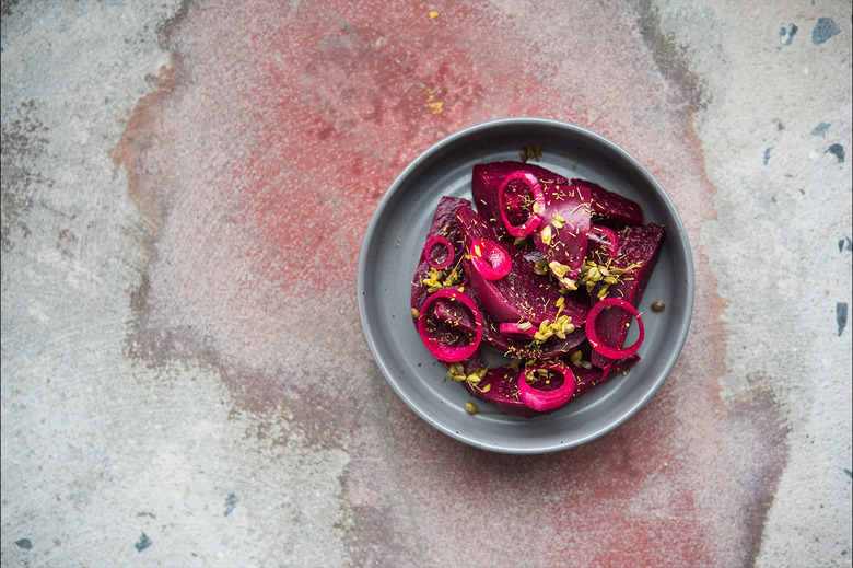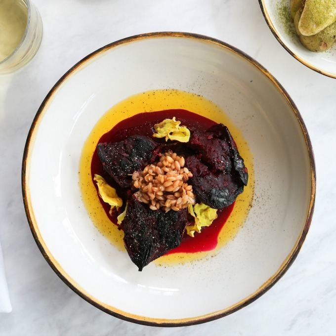 Charred beets are paired with rye berries at Brooklyn's new Mettā. | Photo: Katie Burton