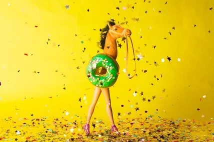 What exactly is a reverse centaur, you ask? The concept is simple. Picture, if you will, the traditional centaur we all know and love (right?! no? that's just us??): the head and torso of a young, chiseled man, coupled with the glossy, muscular legs and backside of a wild horse. Now, imagine instead the reverse: the long, athletic legs of a human, paired with the beautiful, untamed head and mane of a horse. Stuffed in a doughnut. And there you have it.