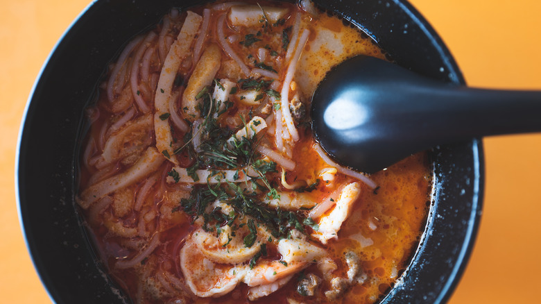 Katong laksa starts with a broth that calls to mind the Singaporean horizon on a clear evening. The fiery, red-orange-yellow soup is colored and flavored with a spicy paste made from potent ingredients like turmeric, ginger, garlic, galangal, red chilies, shallots, and belachan (shrimp paste) — among other ingredients. It's balanced with velvety coconut milk and herbaceous Vietnamese coriander, then filled out with rice noodles and bean sprouts. Fish cakes, prawns, and puffed tofu provide added protein heft. Altogether, Katong laksa imparts a lip-tingling taste that's hard not to slurp down all at once.