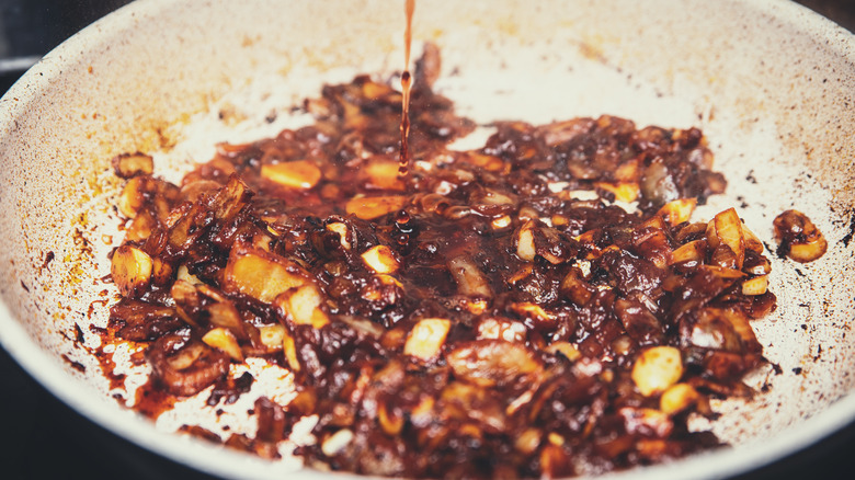 Deglazing is a cooking technique that removes small flecks of food from the bottom of a pan after it's finished cooking. The resulting concentrate is rich in flavors and can be repurposed into the recipe. Deglazing the pan after caramelizing onions, for example, is the perfect way to remove the caramelized bits of onion that can impart a lot of flavor into a glaze or a seasoning. Typically, this process is done with wine, vinegar, or broth, but since we're a fan of the flavor, we recommend you use tomato paste.