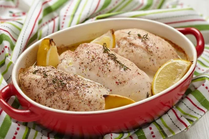 Parchment paper protects the breasts, allowing them to baste in their own juices. To get started, pat the chicken dry, season it and transfer it to a casserole pan or baking sheet. Then, cover just the chicken with a layer of parchment paper, place it in a preheated 350- or 400-degree oven, and cook until it reaches an internal temperature of 165 degrees. Keep in mind the chicken will cook a little more once it's removed from the oven.