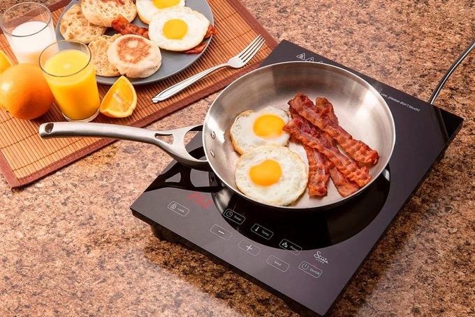 Light and portable, this gadget cooks food quickly without an open flame or hot metal. Compatible with any magnetic cookware, the cooktop has eight power settings (ranging from 200 to 1,800 watts), eight temperature levels (ranging from 140 to 460 degrees) and a built-in timer.