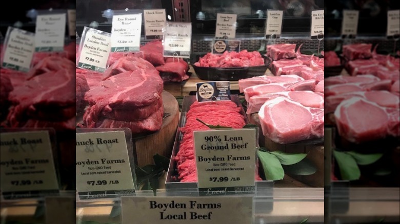 A large portion of meat in the case is considered to be grown under an "all-natural" regime. This claim means that the beef has not been altered by adding coloring agents, other ingredients like marinades, or chemical preservatives. "All-natural" meat can only be claimed after the meat was processed and has nothing to do with how the animal was raised, so the animal could receive hormones or antibiotics and still be marketed as "all-natural." In addition, no governing organizations control how the marketing claim is used — so it's more of a gimmick than a founded distinction.