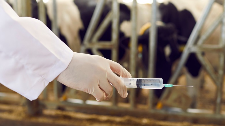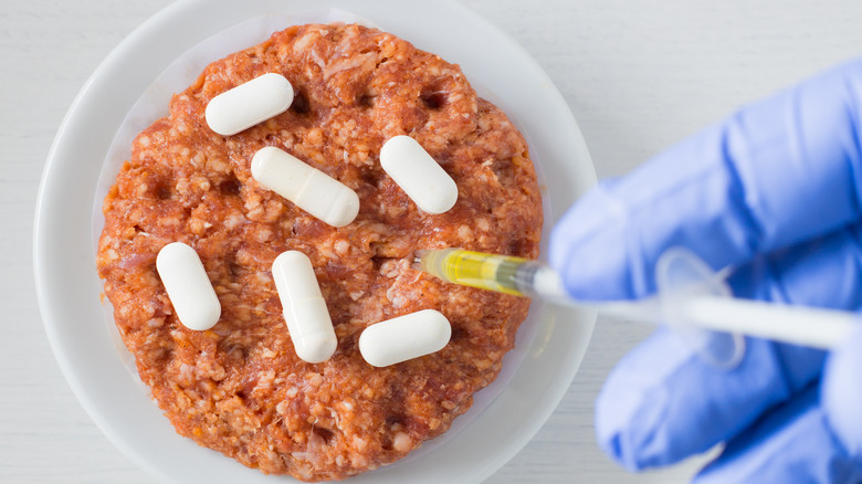 The use of hormones in beef production is a contentious issue. Producers often give cows hormones, some of which are naturally occurring, like estrogen and androgens, to boost body mass before slaughter. This, in turn, decreases the amount of time the cow spends in a feedlot on grain. These hormones are delivered via a tiny implant placed under the skin near the cow's ear, which is then discarded during processing.