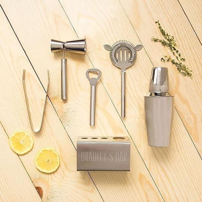 This custom engraved cocktail kit will hopefully be the start of their home bar—one that isn't stocked with cheap plastic handles of vodka.