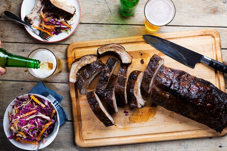 ② Once everyone is present and accounted for, place the papayas in the oven and the ribs on the grill. That way, by the time everyone has thrown back their first avocado soup shooter, it will be time to carve the ribs and dig in.
