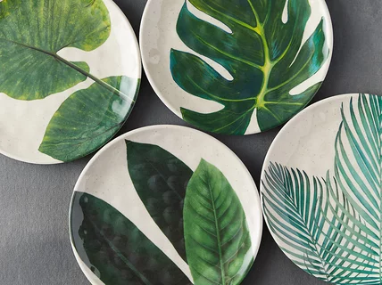 Tropical leaves decorate these shatterproof plates, made from a blend of bamboo fibers and melamine.