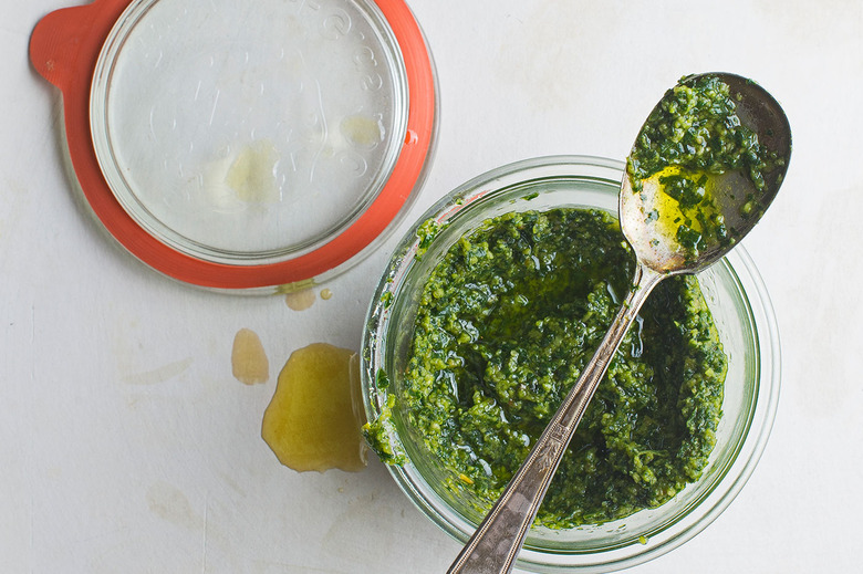 This silky sauce's main ingredients are basil, pine nuts, Parmigiano-Reggiano and olive oil. Simple, right? Toss it with your favorite pasta or stir it into creamy ricotta for a perfect spring crostini topper.