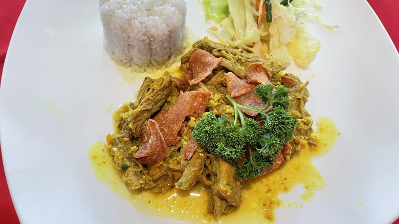 The spices used to flavor the duck are familiar — turmeric, garlic, ginger, lemongrass, chili, and coconut. The duck is then stuffed with the spice mixture and wrapped in banana leaves before being steamed or roasted until fully cooked. Bebek betutu is rich and flavorful, combining different fragrances and tasting notes, from spicy to pungent and salty. The duck is typically served with a side of steamed rice and morning glory, a type of leafy green vegetable that is popular in Southeast Asia. The greens bring a welcome variation to the flavor explosion and introduce some earthy undertones. It's also served with coconut, which adds a creamy element to the meal.