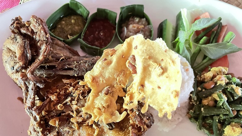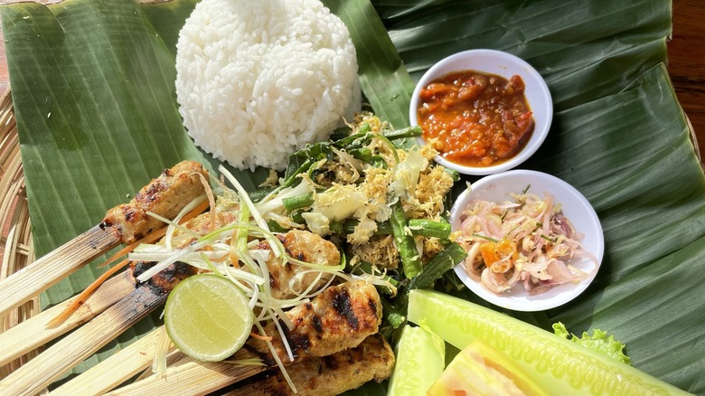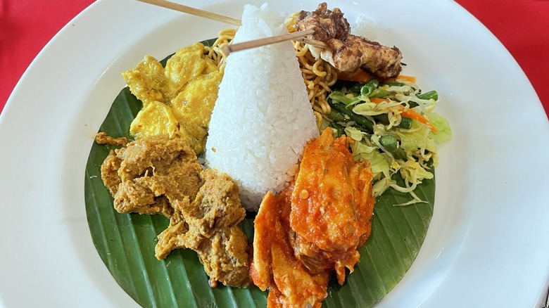 Since it's made up of so many things, the flavors of nasi campur can vary depending on the dishes chosen, but most are usually sweet, piquant, sour, and savory. The rice acts as a base and helps balance the different flavors. Some common ingredients include grilled or fried chicken, beef rendang, spicy eggplant, crispy tempeh, and sambal. In addition, the dishes are often made with fragrant spices such as lemongrass, turmeric, cloves, and coriander, which add depth and complexity. Nasi campur is typically served on a large plate or a banana leaf, with the rice in the center and the small food portions arranged around it. The dish is both complex and very filling, and it's usually good to have a drink alongside it, as it's sure to make you thirsty.