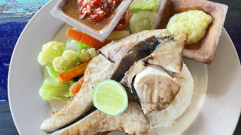Jimbaran-style ikan bakar is a popular dish in Bali, especially in the fishing village of Jimbaran, where many warungs (small eateries) line the beachfront. This delicious grilled fish dish is usually made with mahi-mahi, a firm and flavorful fish perfect for grilling. Since it's cooked over fire, ikan bakar has a wonderful smoky flavor that also carries a certain sweetness typical of freshly caught seafood. The fish is marinated in a mixture of garlic, ginger, turmeric, and lemongrass before being grilled over hot coals until it has a crispy outside and a tender inside.
