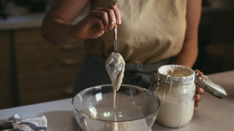 Looking at a sourdough starter alone won't clue you into the right time to start baking with it — especially when you haven't completed enough regular maintenance on it to allow it to grow to its fullest potential. As a standard rule of thumb, it's best to use your sourdough only after it's doubled in size and is visually gassy. But this often depends on the ambient temperatures in your kitchen and the time you feed it.