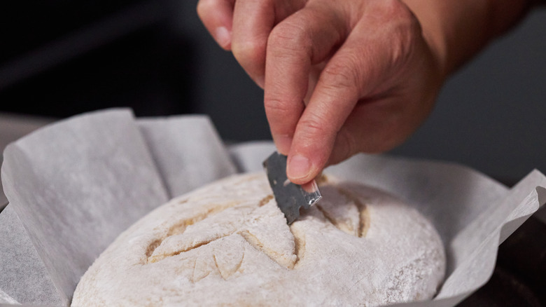 The last-chance method for saving over-proofed sourdough is to score it with a sharp knife. This will allow the carbon dioxide to escape from the loaf without forcing it to collapse in on itself. You can even use your scoring blade to etch interesting designs into your loaf. A sharp paring knife or kitchen shears will suffice for this task, or you can take a page out of the professional bread baker's playbook and use a bread lame.