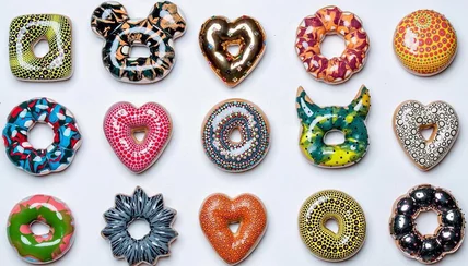 Kim, a graduate of the Hartford Art School in Connecticut, churns out Pop Art doughnuts at his studio in New Jersey. The stunning treats swap out flour and yeast for paint, clay and, in some cases, Swarovski crystals, Colossal reports. But it's that deceivingly shiny potter's glaze—that unfortunately isn't made from sugar—and the detailed imperfections in each piece that make it hard to remember you shouldn't bite down.
