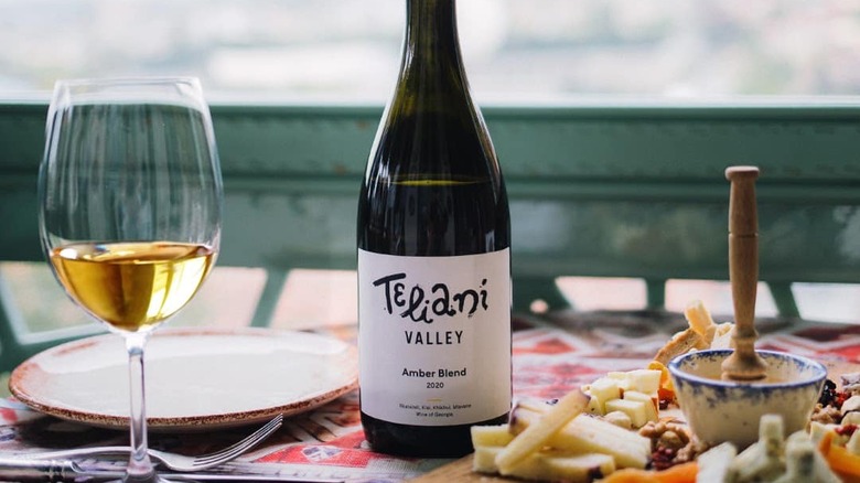 Wine Folly explains that white wine production occurs by pressing freshly harvested grape juice directly off the skins, delivering a light hay-colored liquid. However, the site adds to produce orange wine, winemakers leave pressed white grape juice with the skins for some time. The interaction allows the liquid to absorb the grape's color, tannin, and texture, producing full-bodied, orangish, amber-hued wine.