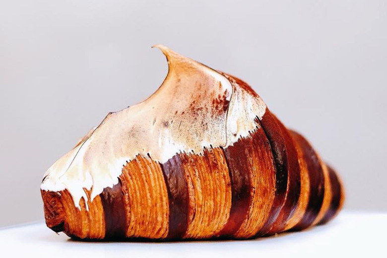 Case in point: The bi-color croissants that look as beautiful as they taste, with red, brown, or green colored bands. They're filled and topped with rotating flavors: on tap right now are warming Spiced Mulled Wine; Winter Ferrero Rocher, which has spikes of torched meringue; and dual core Chocolate Chip Peppermint.