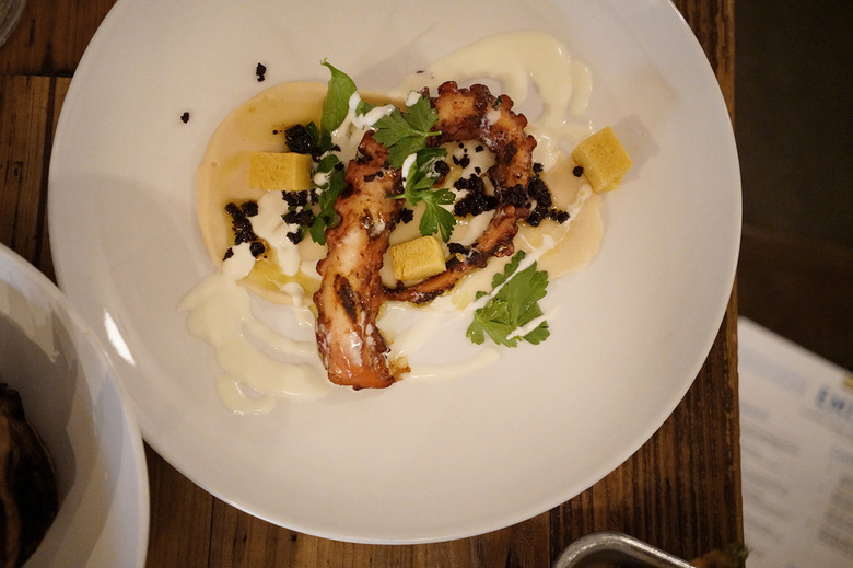 Matt Gallaher's Market Square resto, Emilia, features Italian food with a Knoxville accent. Benton's bacon gives fusilli carbonara a smoky underlayer, while crema made with Cruze Farm dairy finishes a plate of grilled octopus with chickpea croutons.