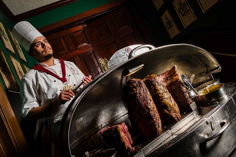 A gleaming rolling cart of Lawry's standing rib roasts clanged to a stop in front of me, and a carver, all self-serious, pivoted to reveal himself. A huge gold medal held in place by a thick red ribbon was draped around his neck, reading The Royal Order of Carvers. (Medieval Times called; they want their playbook back.)