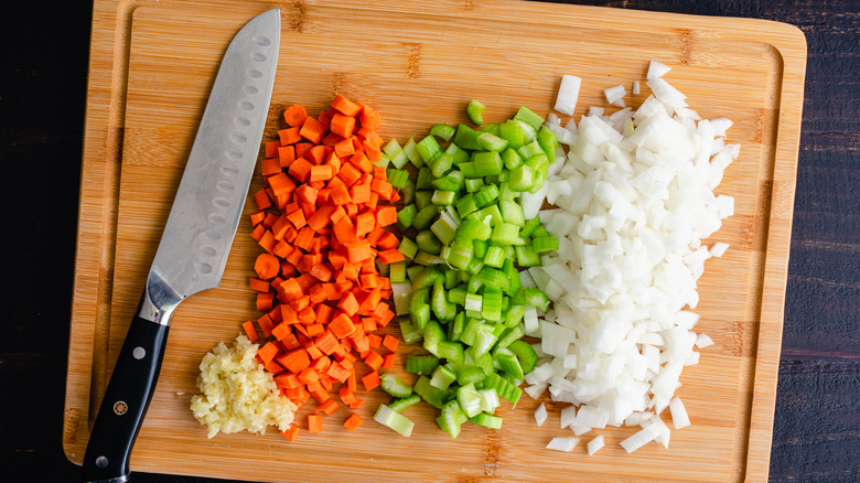 You can use a hand-sized apple or onion to practice correct placement. While chopping, your knuckles should always face up with fingers gripped around the produce. Using your index and middle finger knuckles as guards, you can safely slice at a close range along the widest part of the blade (via YouTube). Cut produce near the knife's handle side to avoid knicks. As you begin, move the knife in a rock-chop motion while your other hand steadies ingredients with the claw grip. After some practice, this technique will prepare you for more improved chopping, dicing, and mincing.