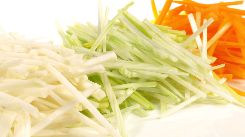 If you're in a time crunch, there's also a quicker way to add some julienne pizzazz to your platter. Rather than cutting your vegetables into rectangles, you can use a bias cut, an angled technique that creates flat slices. From there, the slivers can be stacked and sliced into ⅛-inch julienne strips.