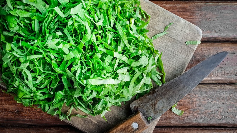 Chiffonade herbs require immediate use, as the cut edges tend to darken rather quickly. That said, certain herbs are more ideal for this style than others. Broad-leafed herbs like sage, mint, and basil work best. The first step to unlocking the fresh herb-filled flavor of basil–or other leafy greens–is to soak the leaves in cold water. After a few seconds, remove and dry them by softly patting them with a paper towel. Making sure to cut the stems, stack the leaves together, and roll them tightly. With the basil securely rolled, you can now use the rock chop method to finely chiffonade (via YouTube).