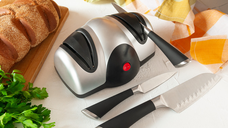 To avoid turning your fingers into baby carrots, the best way to maintain your knives is by using a whetstone or electric sharpener. Going electric may seem most appealing initially, as it does most of the work for you. That said, whetstones are also popular because they're inexpensive and wear less on blades over time. As the name suggests, whetstones must remain wet. According to food content creator Joshua Weissman, one hand should grip the handle to control the angle of the blade while the other applies pressure so it sharpens (YouTube). Using a back-and-forth motion, work your way across the edge, starting towards the handle, then repeat the same on the opposite side. The learning curve may be sharper, but it will certainly provide lasting quality.
