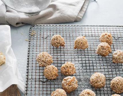In his recipe, tahini works as a binding agent without adding additional sugar, while halvah adds a more complex sweetness. The coconut is still there, but it's heightened by spices that add warmth, tang and zest. All together, these ingredients combine to create spicy, nutty and chewy cookies that blend Middle Eastern flavors with traditional Passover textures. (Bonus: They're super easy to make.)