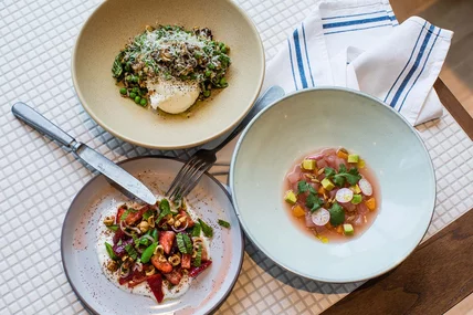 Heading the pastry department is Natalie Saben, who led the dessert program at three-Michelin-starred Grace and is serving huckleberry sundaes with spiced meringue, sunflower cake with strawberry syrup and chocolate mousse with passion fruit and dukkah. Meanwhile, bar manager Scott Stroemer is mixing cocktails like a Paloma with pea-infused tequila and a honeydew-jalapeño shrub.