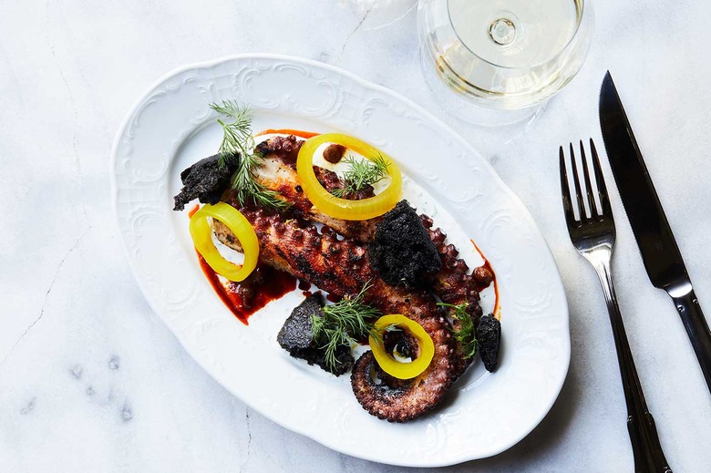 Grilled octopus with herbed yogurt, paprika oil and turmeric-pickled onions.
