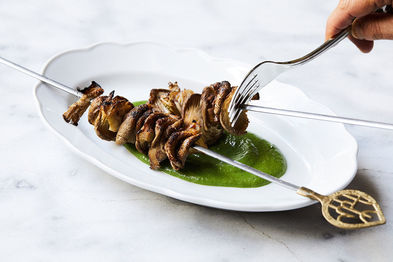 Oyster mushrooms are grilled and served over stinging nettle puree.