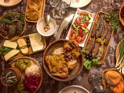 Khachapuri takes a back seat to many flavorful, Mediterranean-like mezes: tomatoes and cucumbers that soak up the nuttiness of unrefined sunflower oil, plates containing eggplant or freshly foraged leeks, morels or stinging nettles. Roast chickens are often served with creamy satsivi, a tahini-like sauce made with ground walnuts, while lamb and veal find their way into chakapuli, a tarragon-based stew. On a Georgian table, there's also almost always a plate of jonjoli, a pickled local flower sprout, which is so ubiquitous locals forget it may be unique to a visitor.