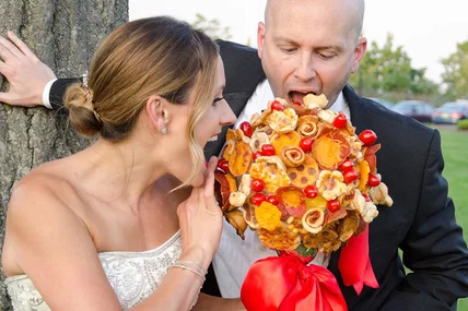 These edible wedding accessories are made of dough, 100 percent whole-milk mozzarella, tomatoes and pepperoni. The restaurant chain, which has 250 locations, spoke to Food & Wine, saying "Perfect for any couple looking to add some fun and flavor to their big day, the Pizza Bouquet and Boutonniere feature beautiful and delicate floral details hand-crafted by New York City food-stylist, Jessie Bearden."