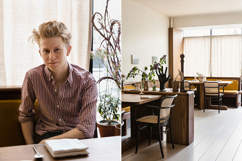 The restaurant, located in Manhattan's Lower East Side, consists of two distinct areas: a 16-seat dining section and a café-style living room. Warm finishes and a palette of mustards and deep wood give the space an inviting vibe, while the divided sections make it feel almost as though you're in someone's apartment, a nod to the at-home dinners that launched his career.