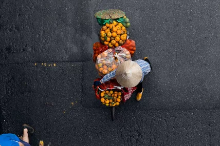 Released last month, Merchants in Motion casts an expressive aerial eye across Hanoi's street market culture, documenting peddlers as they carry their colorful cargo of fruits, vegetables and flowers fastened to their preferred modes of transportation. The 140-plus collection of photographs—which features everything from longan, durian and rambutan to lychees and flowers—makes everyday market goods appear like ephemeral, edible art installations.
