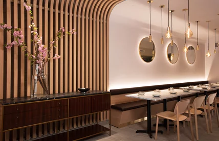 One look around, and you'll notice what he means. Industrial light bulbs hang at various lengths from the ceiling, but the majority of the light is natural, entering from a glass wall at the entrance. With clean sight lines and wood-paneled walls that arch to the ceiling, it's the kind of space you wouldn't expect to serve the kind of food it does.