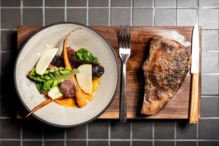 Pork chop with a dish of carrots and boudin noir sausage.