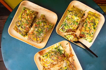 Jian bing hawkers populate just about every corner in Chinese cities; after all, it's one of the country's go-to breakfast options. The handheld snack features a freshly griddled crepe washed with egg and then wrapped around a crispy cracker, pickled mustard, fragrant herbs, and a swipe of hoisin and chile sauce. It's savory and tart, with a kiss of heat.
